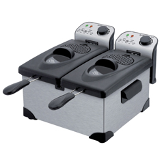 Name:Stainless Steel Deep Fryer MF11 Two basket with 2×3.0 liter enamel or stainless steel bowl 2×1kg food capacity Plastic lid with viewing window and replaceable filters or Stainless steel lid available Cool zone, immersed heating element Variable temperature control with neon indicator light Cord storage and non slip feet Taking apart completely for easy cleaning